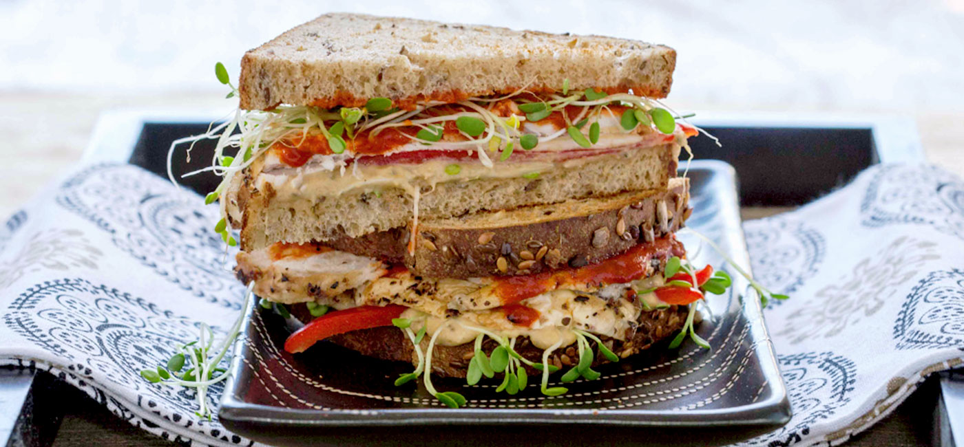 - Add a layer of sprouts, 3 pepper strips and chicken.